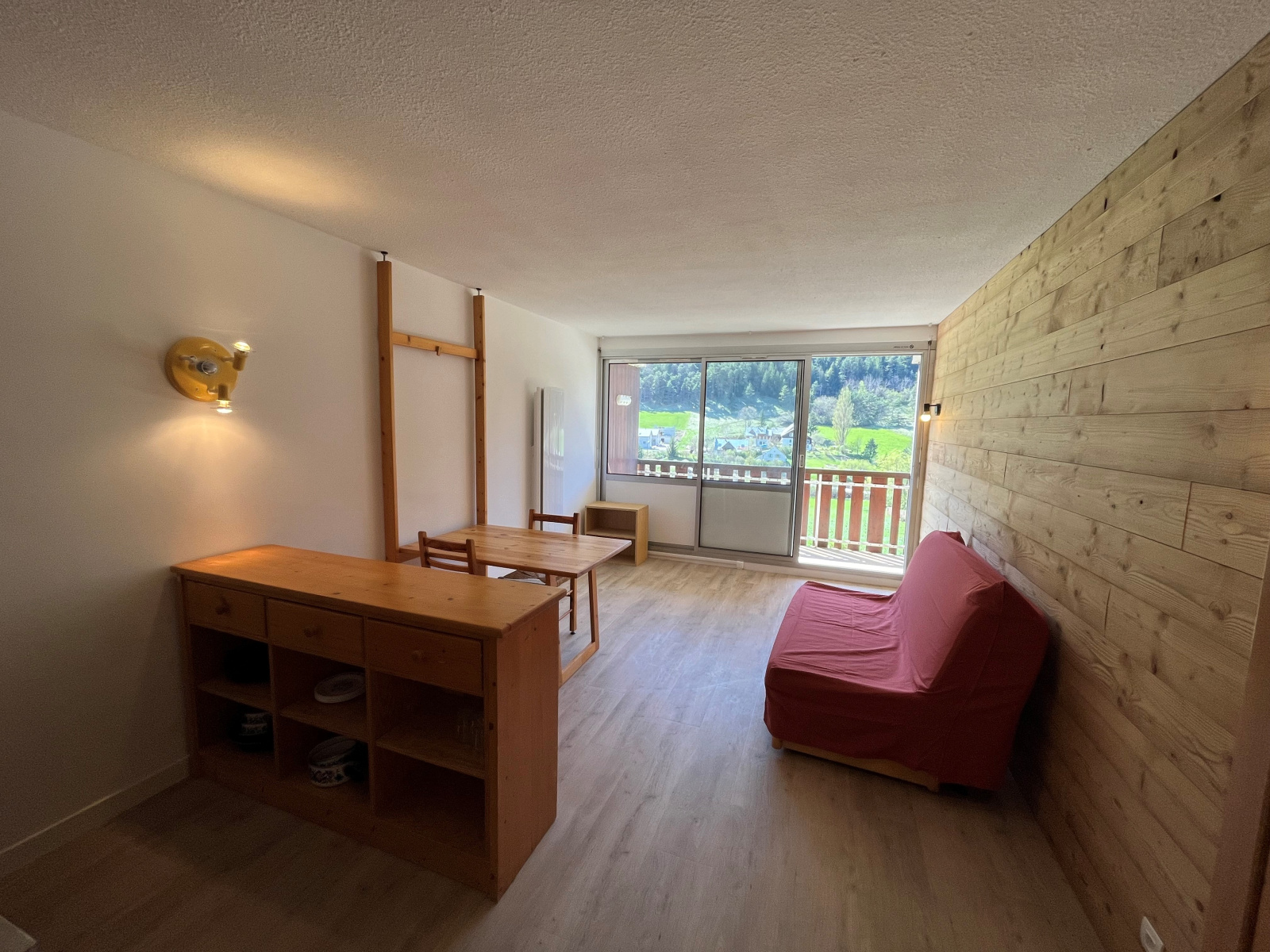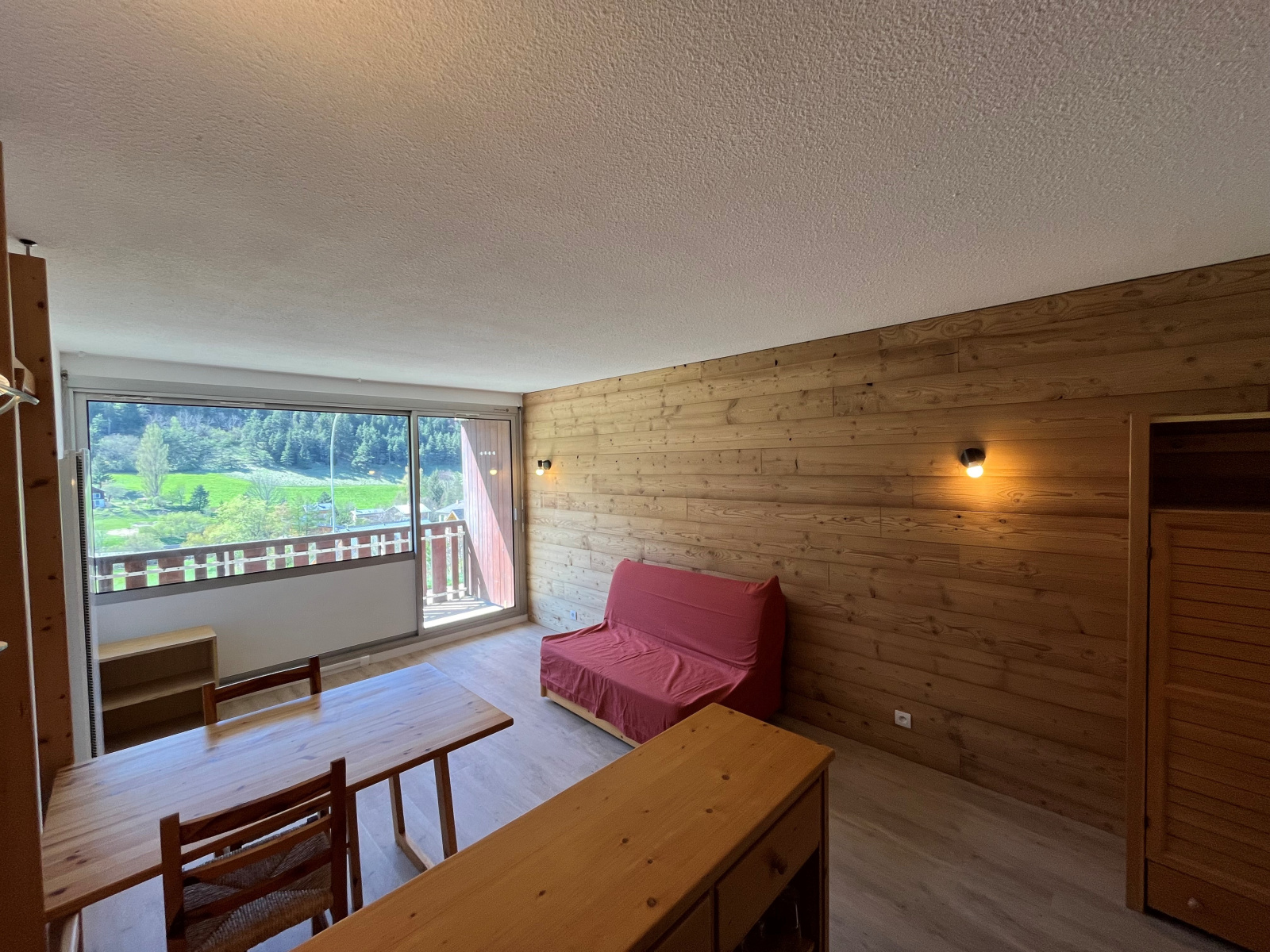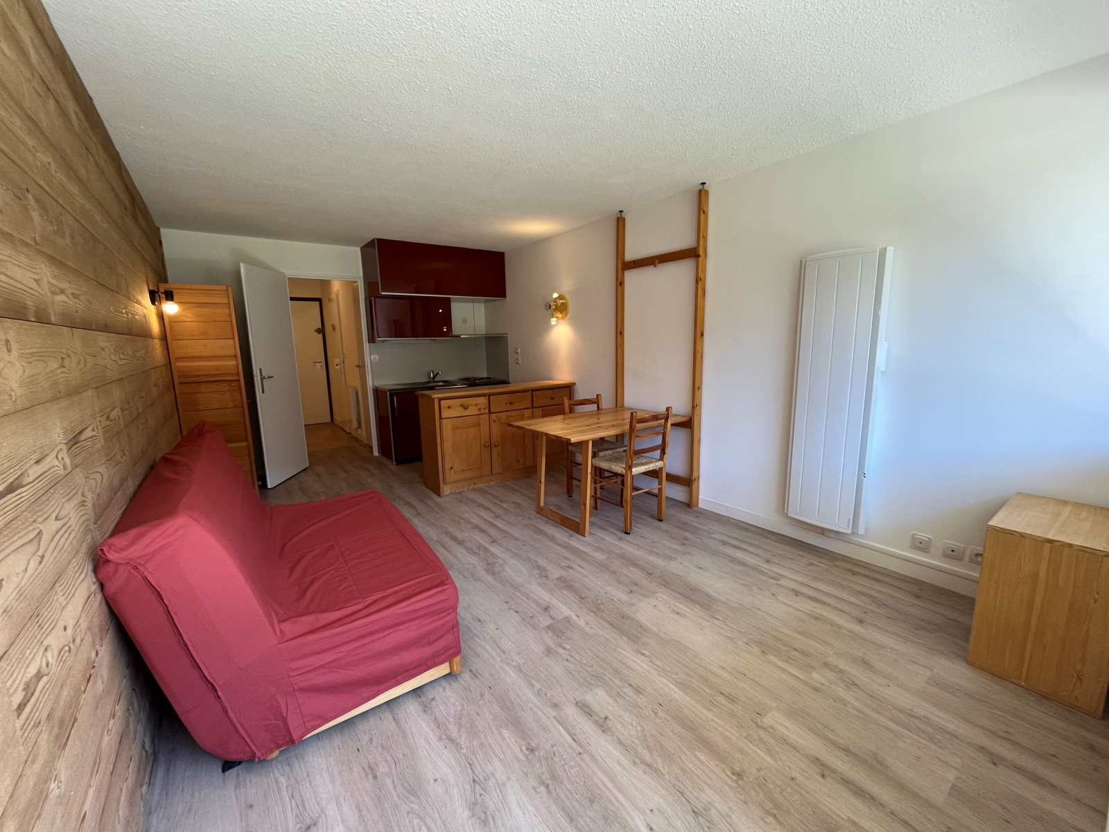 Il dispose d'une entrée avec coin cabine, une salle de bains, un wc séparé, une kitchenette ouverte sur coin salle à manger et séjour donnant sur balcon ouest. Ce studio est vendu avec une place de parking couverte, une cave, un casier a skis.