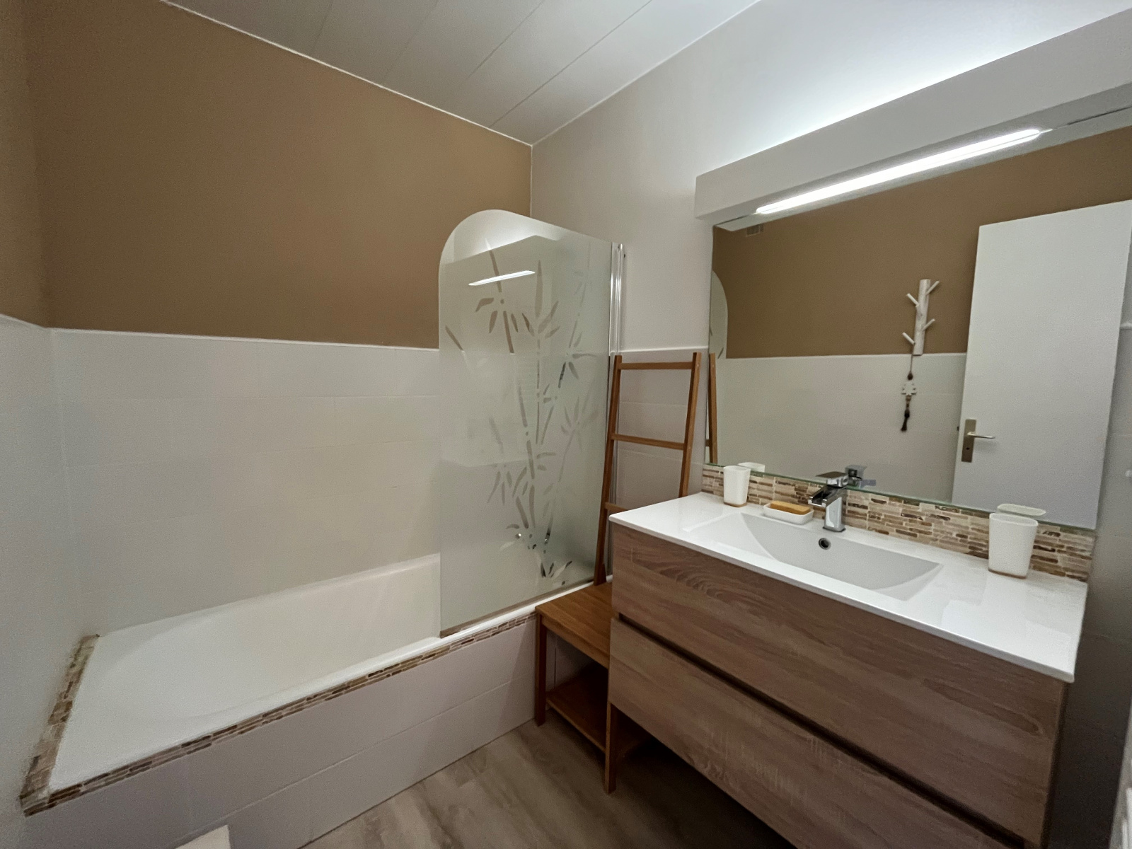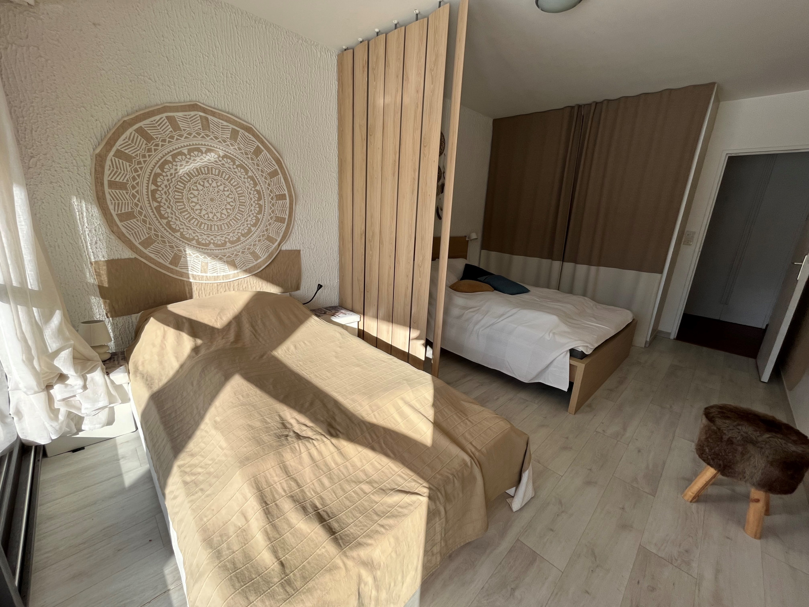 Ce bien idealement agencé se compose d'une entrée avec rangements, un wc séparé, une salle de bains, une tres grande chambre avec deux espaces nuits, donnant sur terrasse, une cuisine ouverte sur séjour/salle à manger donnant également sur terrasse.